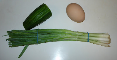 - Chop up green onions and an egg, grate (not chop!) a cucumber. For a single serving you'll need all these ingredients taken together occupy from one quarter to one half of a plate depending on how thick you want the soup to be. The relative amounts of ingredients can be varied, I usually take equal amounts of grated cucumber and chopped onions.